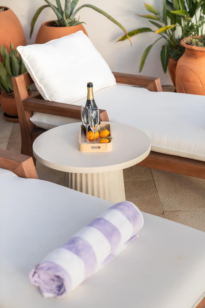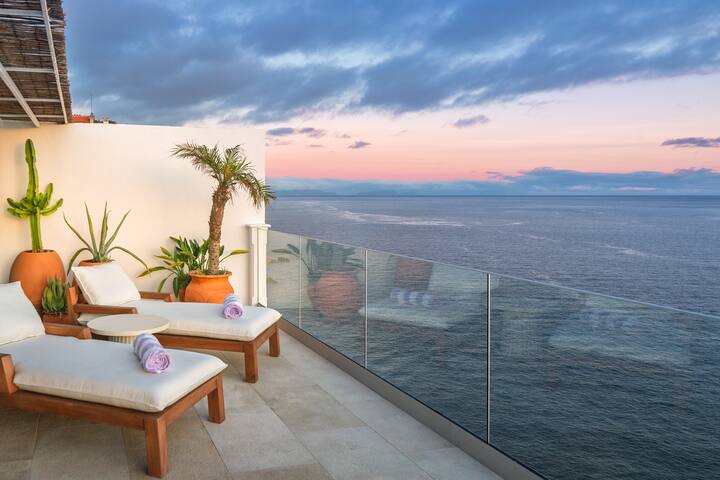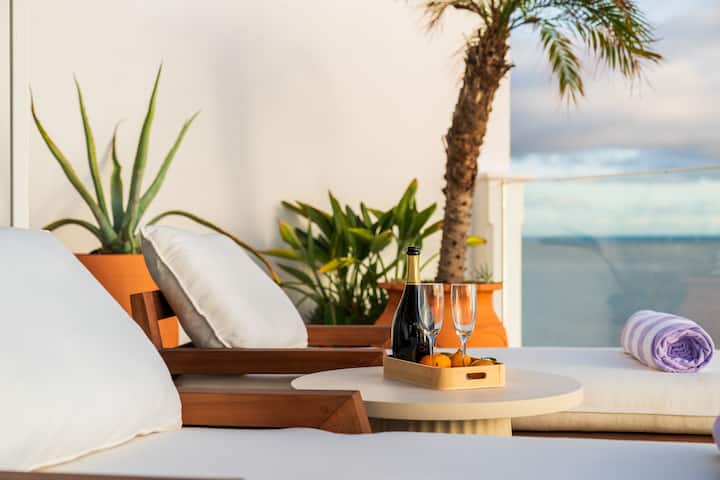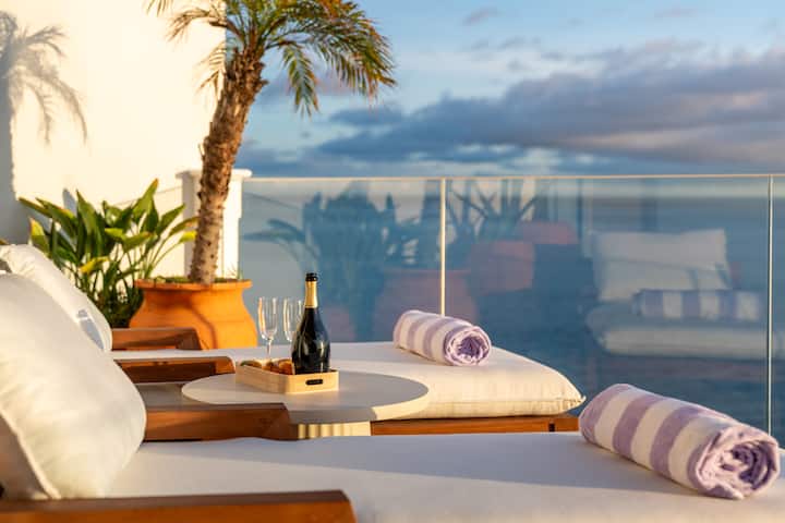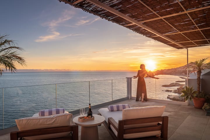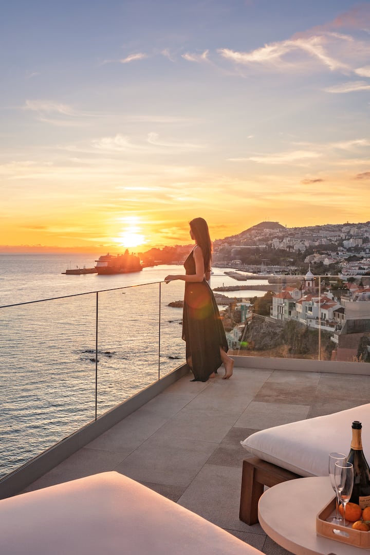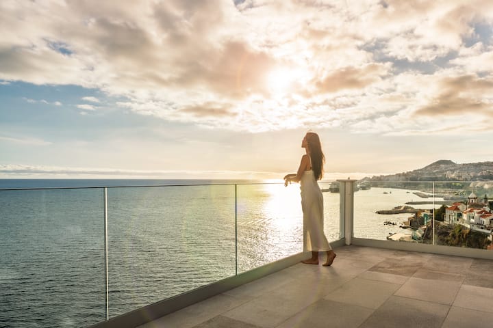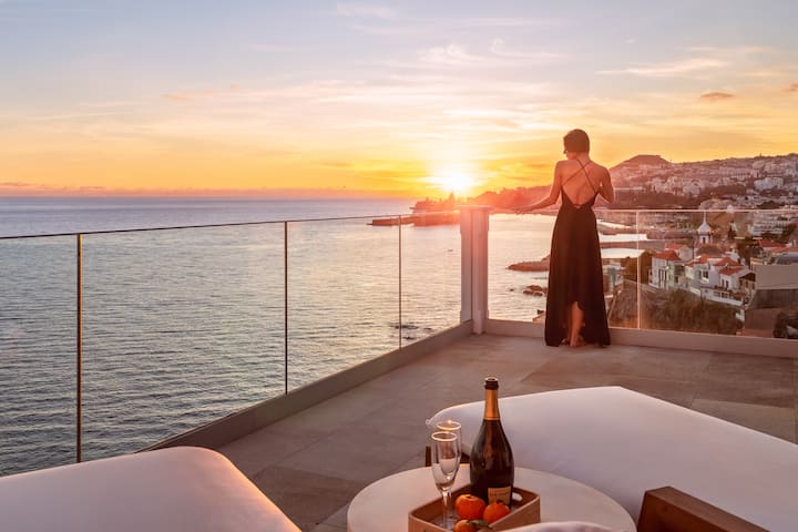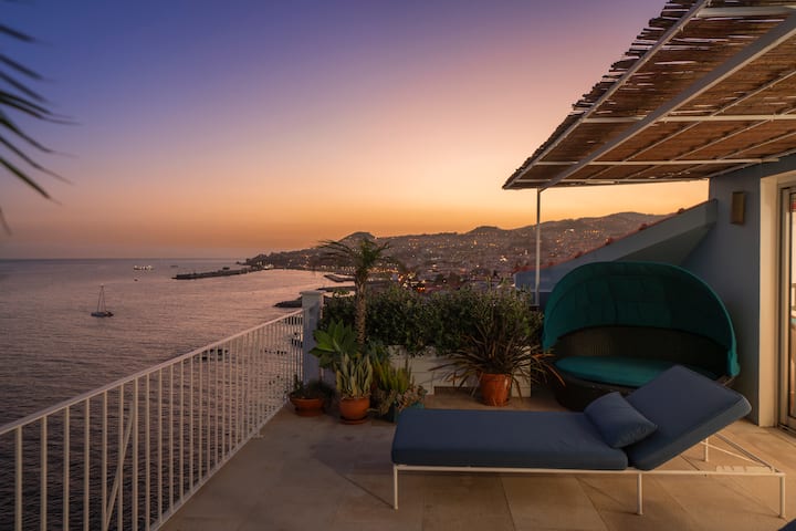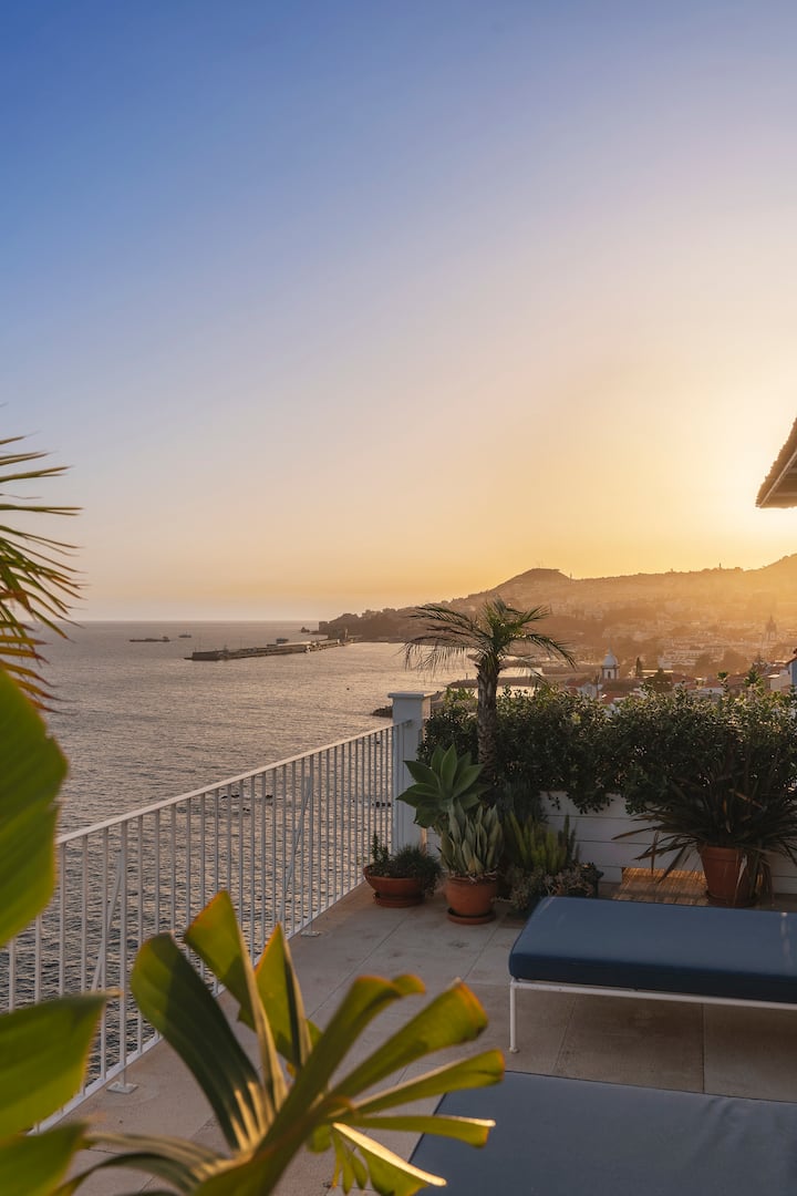 Telhado no último andar para o pôr do sol perfeito de frente para o anfiteatro do Funchal com espreguiçadeiras.