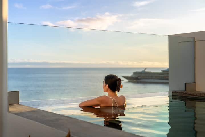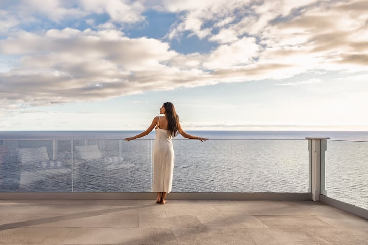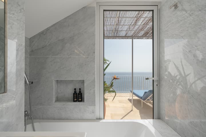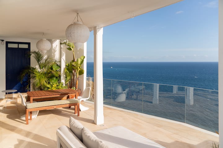 O terraço do meio tem poltronas confortáveis para desfrutar das vistas ilimitadas do mar.