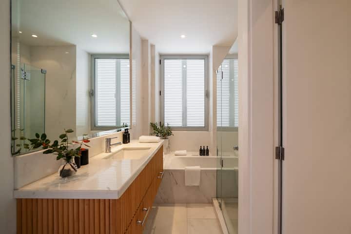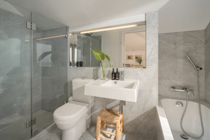 3 CASAS DE BANHO – Moderno com mármore de luxo. 2 casas de banho com banheira e chuveiro de entrada separado. 1 casa de banho com sanita por área de estar.