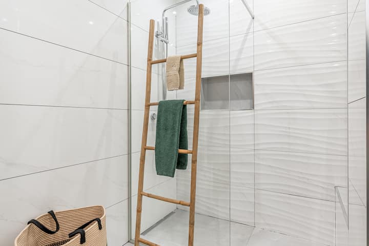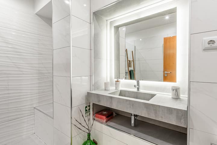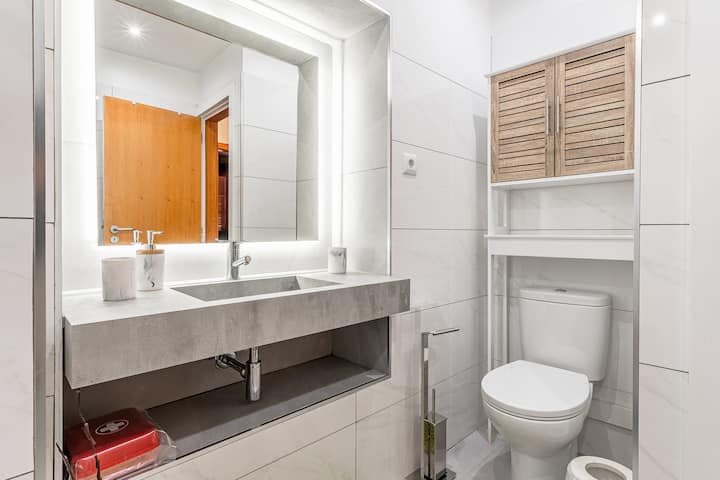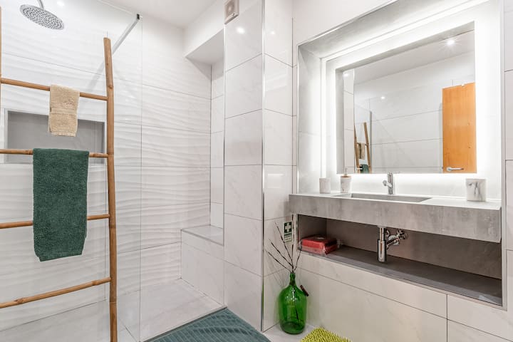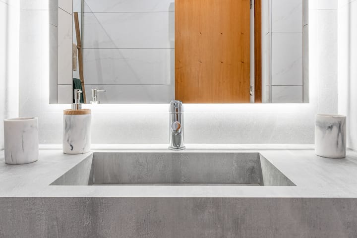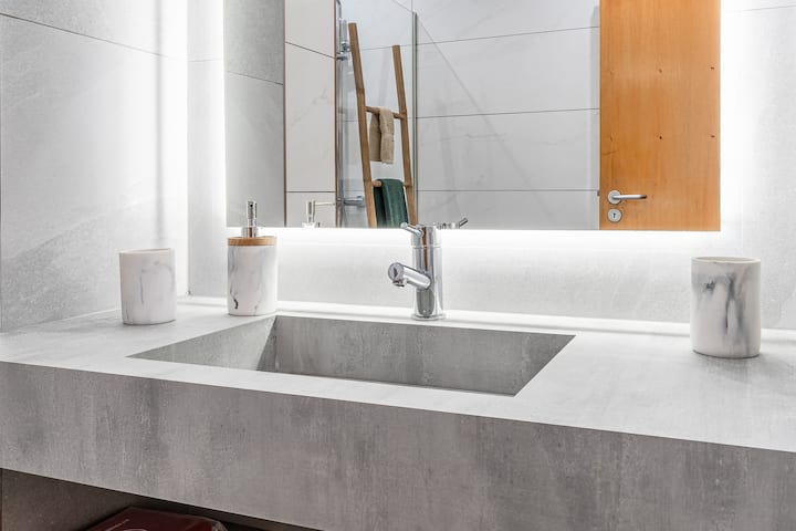 O apartamento conta com uma casa de banho completa, elegante e funcional.